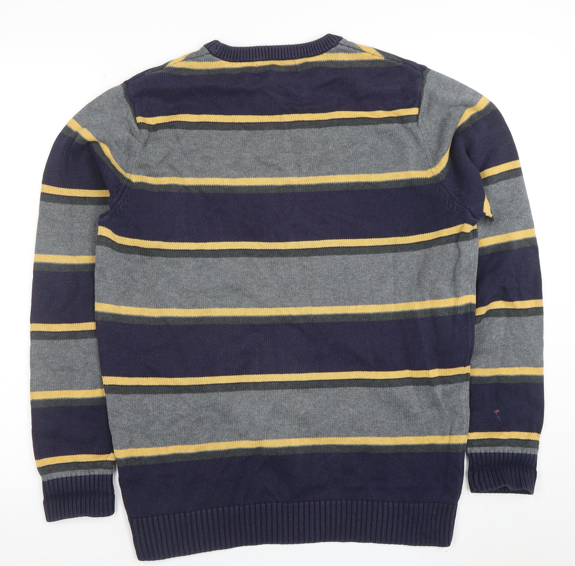 Add a touch of effortless classic style to your wardrobe with this Maine New England men’s striped jumper. Designed in a versatile multicoloured palette of navy, grey, and mustard yellow, this pullover offers a timeless look that’s perfect for casual daywear or relaxed evenings out. Made from 100% cotton, the soft knit fabric provides comfort, breathability, and lightweight warmth throughout the seasons. The crew neckline and ribbed cuffs and hem offer a neat, structured fit that enhances the relaxed silhouette without losing its shape. This regular fit jumper pairs easily with jeans, chinos, or smart trousers, making it a great all-rounder for your everyday rotation. The tight-knit construction ensures durability, while the cotton fabric keeps you comfortable from spring through to winter. Stylish yellow and grey stripes contrast neatly against a navy base for a look that feels both modern and classic. While pre-owned, this jumper remains in very good condition, showing only a small faint pink mark on the back that doesn’t detract from its overall appearance. Whether you’re layering it for extra warmth on cooler days or wearing it on its own, this jumper is a reliable and comfortable choice. Perfect for casual outings, workwear, or relaxed weekends, the Maine New England striped cotton jumper combines easy wearability with timeless appeal. It’s a go-to piece that complements various styles while maintaining the quality and comfort expected from Maine New England. Ideal for men looking for a durable, stylish knitwear option that fits well and feels great. A great blend of comfort, versatility, and subtle smartness, this jumper belongs in every man’s wardrobe.