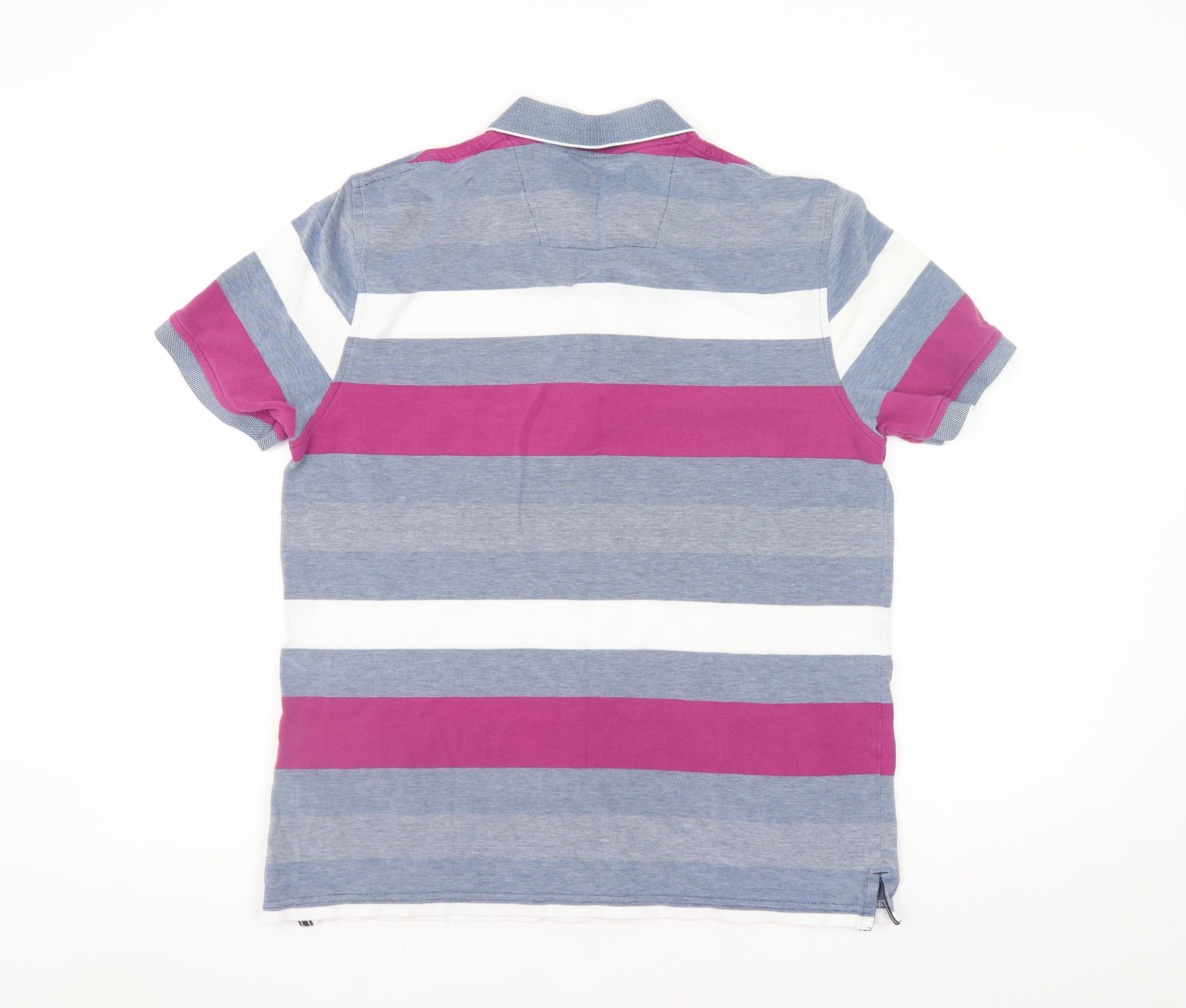 Step into effortless casual style with this Maine New England men's polo shirt, designed with comfort and modern flair in mind. Crafted from 100% soft, breathable cotton, this shirt ensures lasting comfort throughout the day. The regular fit cut offers a relaxed yet smart silhouette that easily transitions from weekend wear to casual Fridays at work. Featuring a classic collared neckline with a three-button button-down placket, it delivers traditional polo styling that never goes out of fashion. The multicoloured design with bold horizontal stripes in shades of blue, white, and magenta adds an eye-catching yet refined touch to your look, providing a versatile piece for layering or wearing on its own during warmer months. This polo is constructed from lightweight jersey fabric that feels soft against the skin, providing excellent breathability and durability. The quality cotton construction makes it easy to care for, being fully machine washable for added convenience. Perfect for spring, summer, and even autumn layering, this polo captures a timeless preppy aesthetic that suits men who value both comfort and neat style. Maine New England, a trusted name in casual menswear, brings reliable quality and classic design together for an easy-going wardrobe essential. Pair it with chinos or denim jeans for an effortless, polished weekend outfit. The shirt shows minimal signs of wear and remains in excellent used condition, ensuring many more wears to come. Ideal for everyday casual occasions, travel, or laid-back gatherings, this striped polo provides the versatility and quality you expect in a smart-casual staple. A must-have addition to any man's wardrobe, this Maine New England polo shirt upgrades your casualwear selection with ease and value.