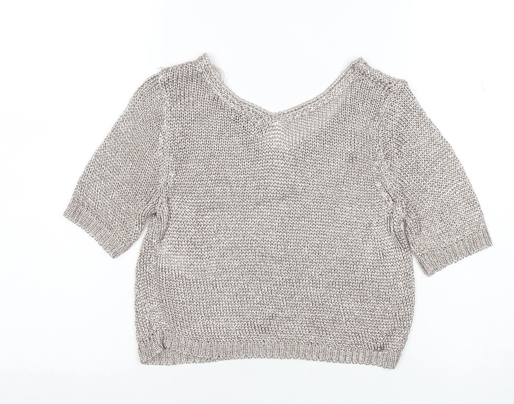 Add a touch of effortless sparkle to your wardrobe with this stunning Topshop Petite women’s cropped blouse in silver. Designed in a lightweight open knit fabric, this top is perfect for spring and summer days or evening occasions where you want to shine without sacrificing comfort. The piece features a flattering V-neckline and short fitted sleeves, keeping the look feminine and relaxed. Its cropped silhouette adds a contemporary edge, ideal for pairing with high-waisted jeans, skirts, or tailored trousers. The shimmering metallic finish gives the blouse a chic, modern flair that works beautifully for casual meetups as well as party and cocktail outings. Crafted from a quality blend of 70% viscose and 30% metallic fibre, it’s breathable, soft against the skin, and lightly stretchy for a comfortable fit. The petite sizing and UK 8 fit make it perfect for those who prefer their tops to sit neatly without overwhelming the frame. Finished with ribbed trim at the cuffs and hem for subtle structure, this pullover-style blouse embodies an understated glamour that Topshop is known for. The neutral silver tone complements a variety of colours and can be styled up or down with ease. Despite light signs of wear, the blouse remains in excellent condition, ready to refresh any outfit with its luminous charm. Ideal for day or night looks, this Topshop cropped knit top brings together comfort, style, and versatility in one standout piece. A must-have addition to any fashion-forward wardrobe.