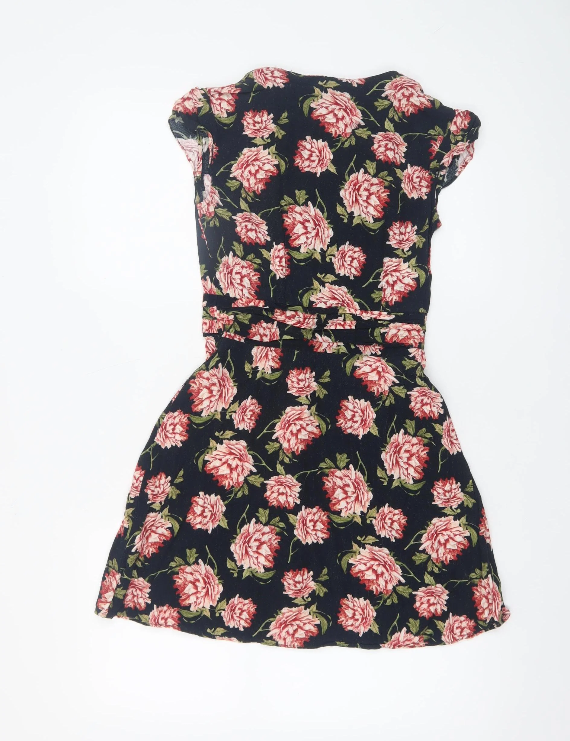 Add a touch of effortless elegance to your wardrobe with this gorgeous Topshop women's floral fit & flare dress. Designed in a flattering short-length silhouette, it features a beautiful vintage-inspired print of soft pink and red flowers against a chic black background. Crafted from 100% viscose, this lightweight woven dress offers a breathable and comfortable wear suitable for warmer seasons. The short cap sleeves and V-neckline enhance its feminine appeal, while the button-down front adds a casual charm and easy wearability. Perfect for spring and summer, this piece can transition seamlessly from day to evening. Pair it with sandals or trainers for a laid-back daytime look, or dress it up with heels and statement jewellery for a party or cocktail outing. This versatile dress embodies Topshop's signature modern aesthetic and attention to detail, making it a stylish addition to any contemporary wardrobe. Whether you’re heading to brunch, a garden party, or a summer evening event, this dress is an ideal choice that blends comfort with timeless floral style. In excellent pre-loved condition with only minimal signs of wear, it remains a beautiful, wearable piece at a great value. Machine washable for easy care, it's a reliable go-to for casual occasions while still being stylish enough for more special events. A must-have staple for anyone who loves relaxed yet polished fashion.