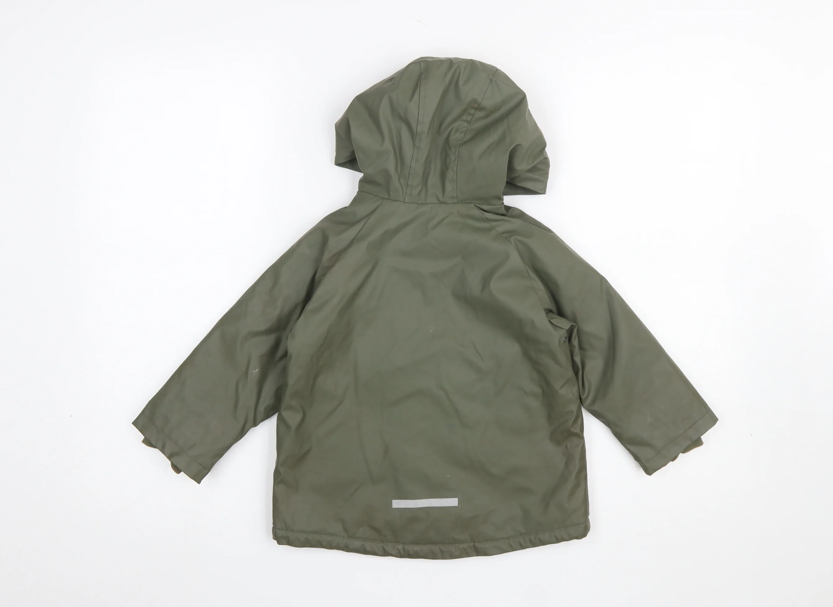 Keep your little one warm and dry in this stylish green Zara boys’ rain coat, perfect for cool autumn and winter days. Crafted from durable 100% polyester, the jacket features a smooth waterproof outer shell with a snug synthetic fleece lining to ensure ultimate comfort and insulation. The mid-length design provides excellent coverage without restricting movement, making it ideal for outdoor play, walks, or school days. The coat includes a secure hood to protect from light rain, a zip front with snap button fastening for extra wind protection, and two side pockets that offer both practicality and classic style. The subtle reflective strip on the back adds extra safety for low-light conditions, while the adjustable sleeve straps enhance fit and comfort. Designed with a simple, versatile appearance, this coat seamlessly blends functionality with timeless design. The softshell fabric and insulated inner make it suitable for layering over jumpers or sweatshirts during colder weather. Machine washable and easy to care for, it’s a practical addition to any young boy’s wardrobe. In very good condition with only light wear and small minor pulls near the front, this pre-loved coat remains fully intact, ready for many more outdoor adventures. Ideal for parents looking for quality, durability, and classic fashion from a trusted brand like Zara, this jacket combines everyday comfort with lasting style—perfect for keeping your child warm and happy whatever the weather.